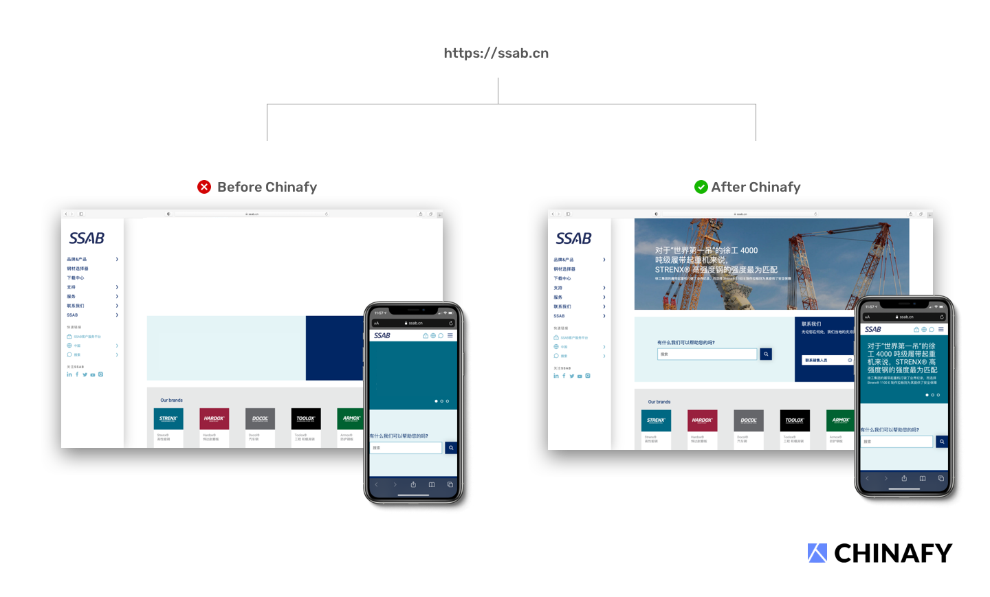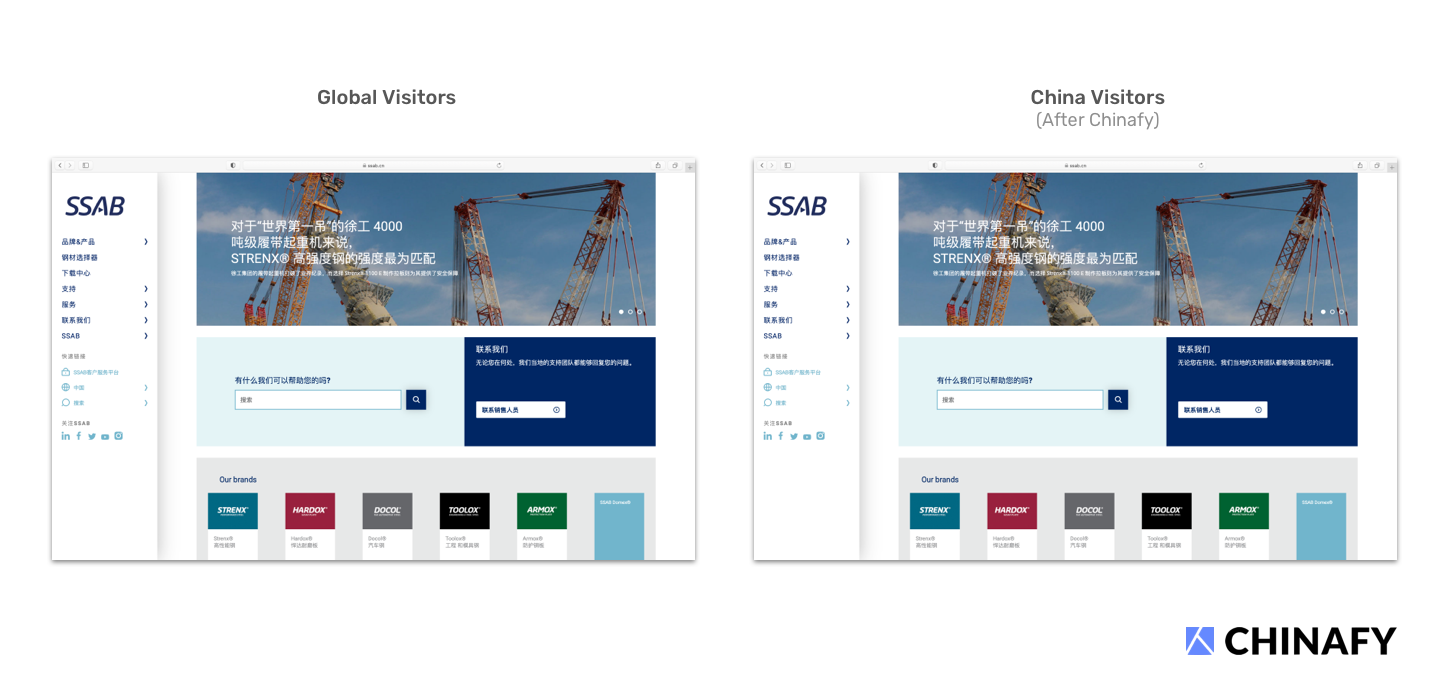 The Chinafy version of the SSAB regional site looks exactly the same as its original version - except it’s much faster in China. Pretty cool right?