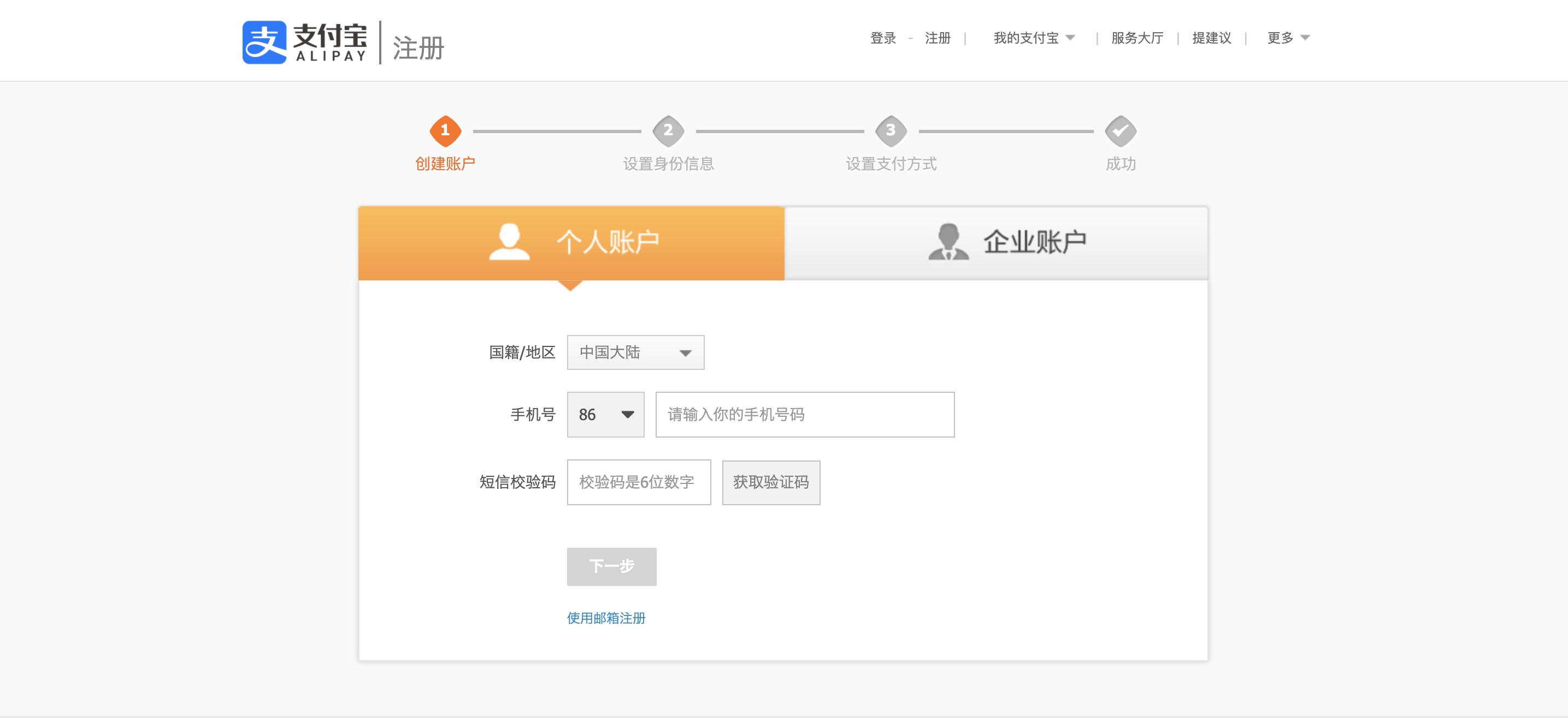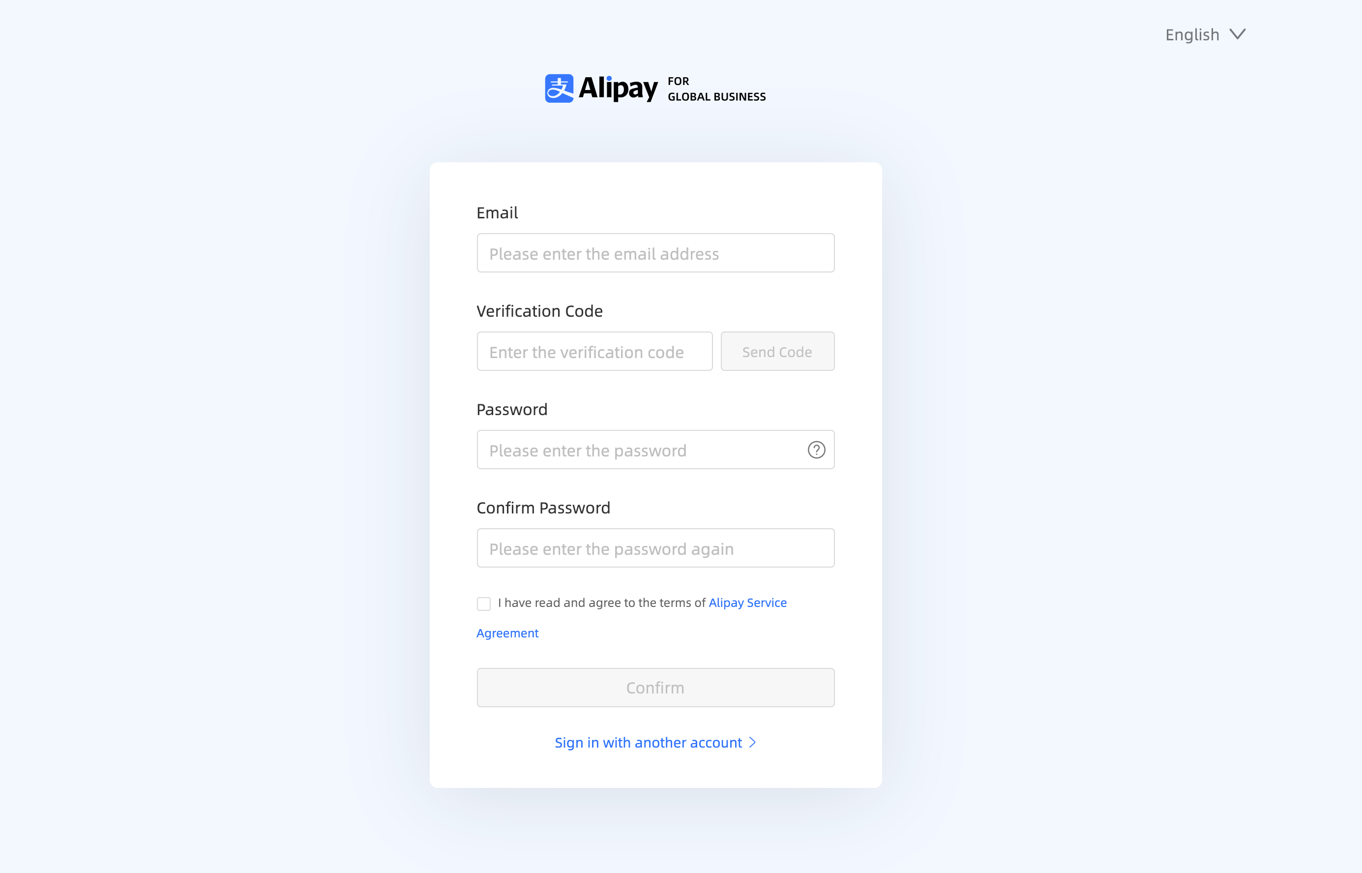 1. Creating a business account with an email address on Alipay Global. There are various language settings (English, Spanish, Italian, Russian and French) on the top right corner.