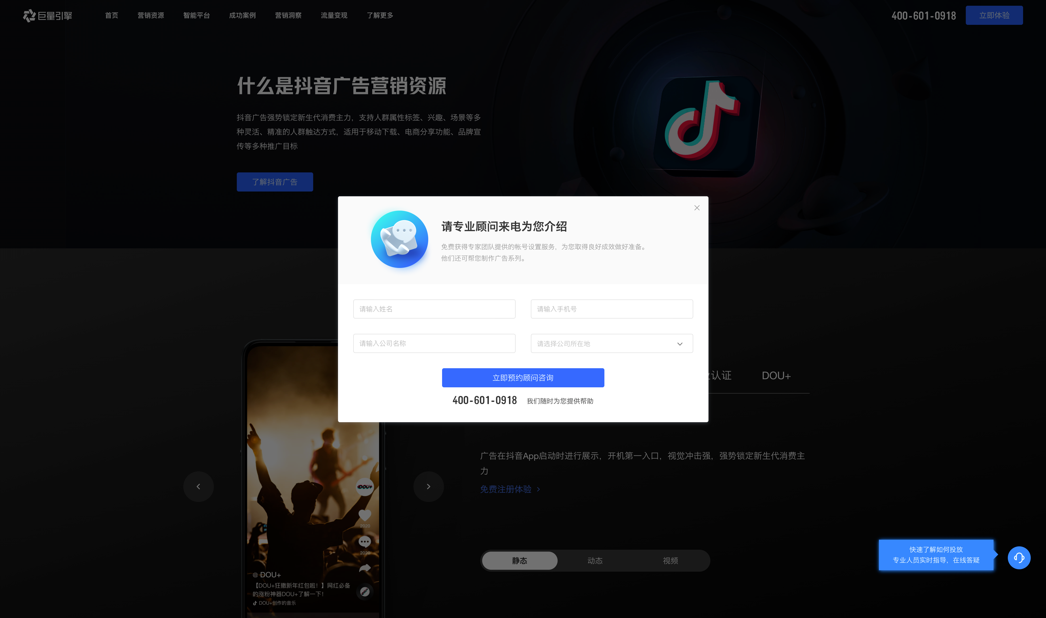 You may get started by leaving your phone number (China-registered) and company name for the Ocean Engine team to get in touch with you. Alternatively, you may also call their hotline at (+86) 400-601-0918.